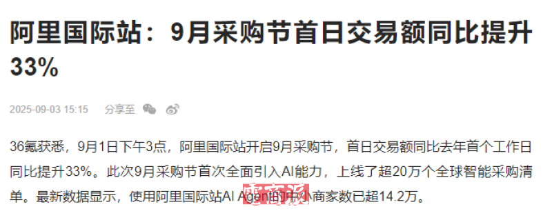 9月3日消息,阿里國際站于9月1日下午3點(diǎn)開啟全年最大旺季9月采購節(jié)。9月采購節(jié)一直是海外買家備貨年底黑五、圣誕季、新年等節(jié)點(diǎn)的集中爆發(fā)期,而本屆9月采購節(jié)首次全面引入AI能力,從搜索推薦、智能導(dǎo)購、供需匹配等關(guān)鍵環(huán)節(jié)實(shí)現(xiàn)全面升級。數(shù)據(jù)顯示,首日交易額同比去年首個工作日同比躍升33%,實(shí)現(xiàn)開門紅。